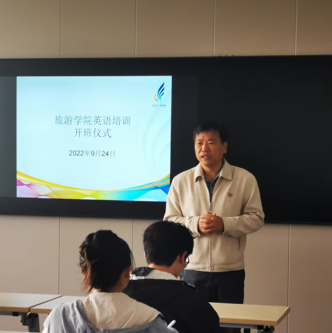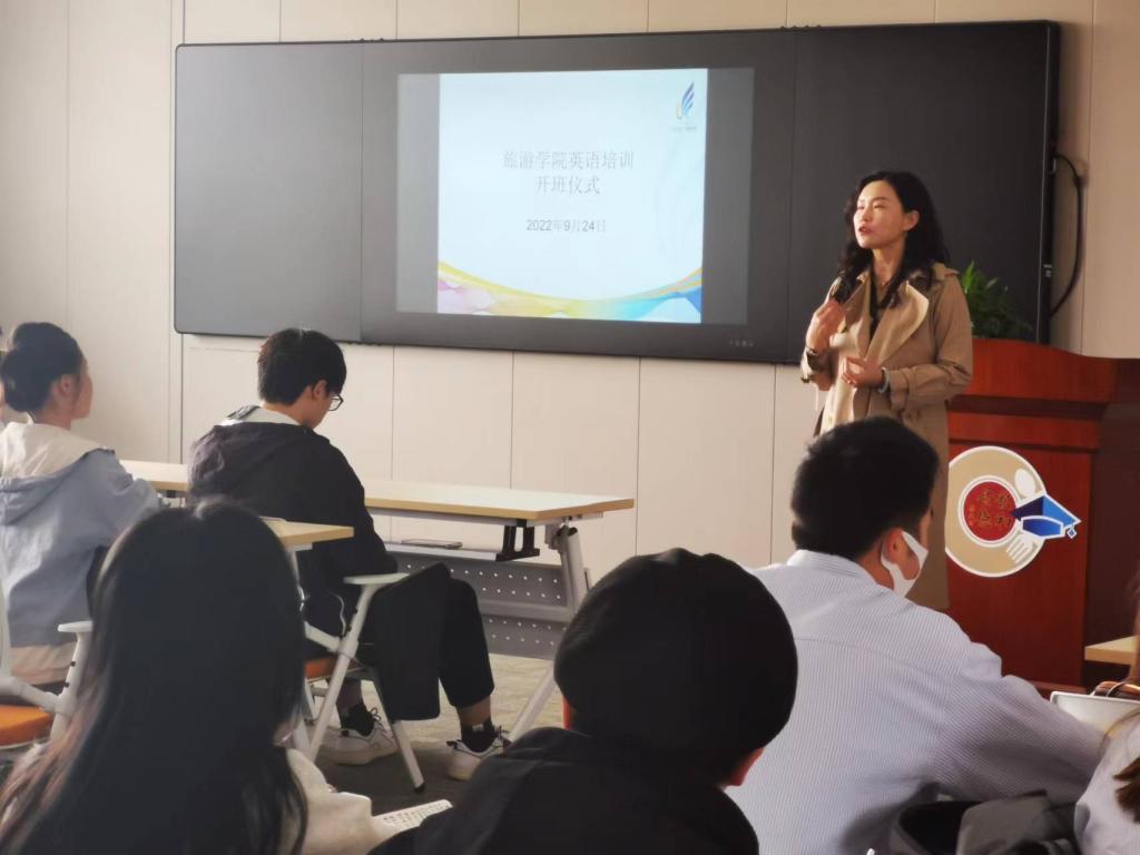 2022年9月24日上午,旅游学院于惟行楼6301隆重举行首届英语培训班开班仪式。旅游学院田芙蓉院长、孙志强副院长、陶柯方老师和参加英语培训的同学出席开班仪式。